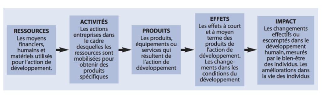La chaîne de résultats comprend 1) les ressources; 2) les activités; 3) les produits; 4) les effets; 5) et l’impact (cf. Fig 1).
