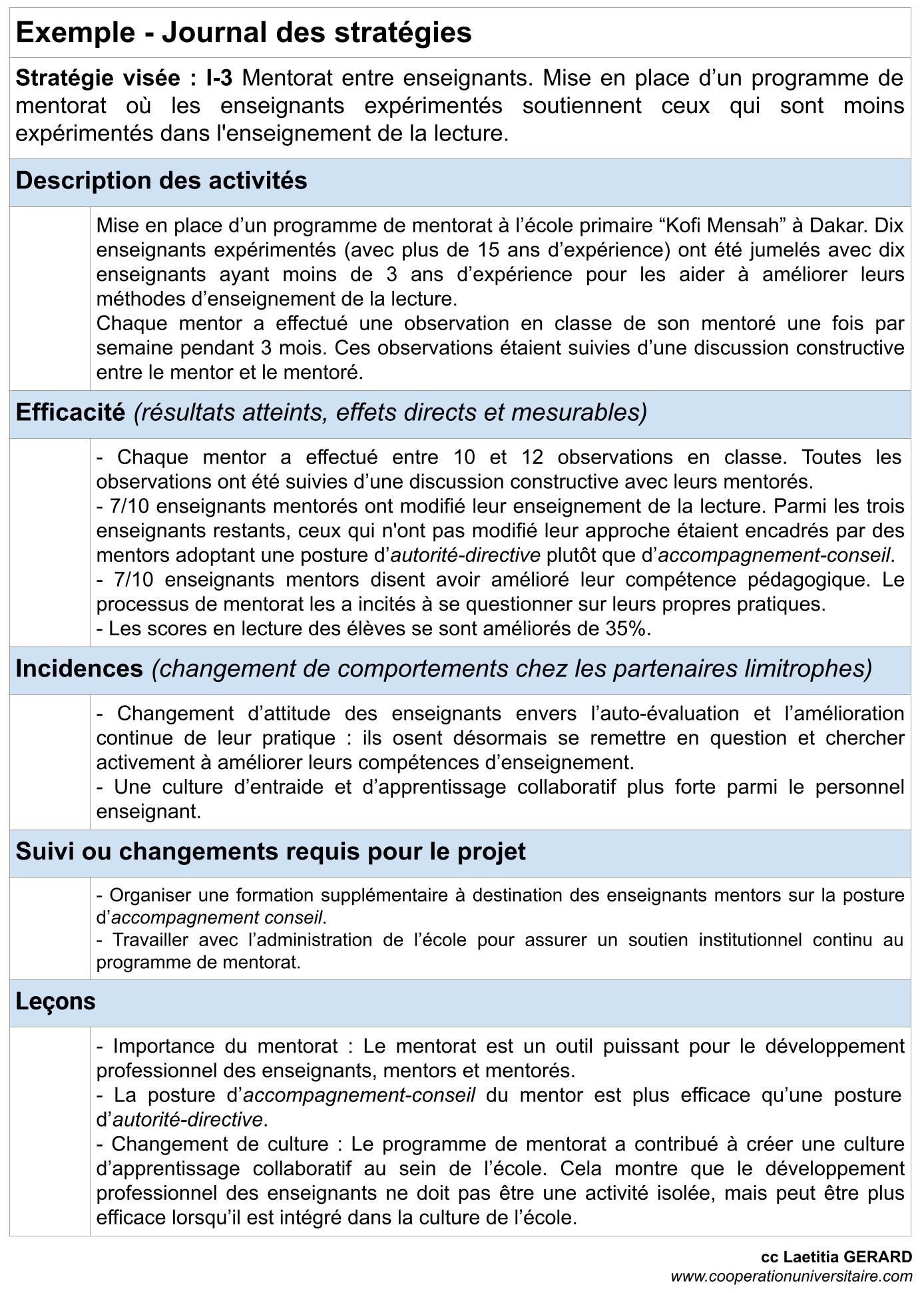 A partir de la grille stratégique ci-dessous, voici l’exemple d’un journal des stratégies pour la stratégie I-3 « Mentorat entre enseignants ».